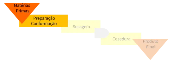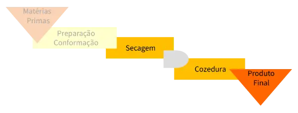 A secagem é assegurada por um secador túnel semi-contínuo, sendo a cozedura efectuada numforno túnel contínuo de 113m, onde os produtos são submetidos a temperaturas até 870ºC, comregulação automática das condições do processamento térmico, optimizada às característicastecnológicas dos produtos.